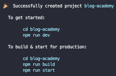 npm을 주로 사용하기 때문에 npm 방식으로 프로젝트를 생성했다. 나는 블로그를 만들고싶은 사람들을 위한 블로그를 만들것이기 때문에 blog-academy라고 지었다.
