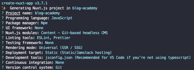 npm init nuxt-app blog-academy